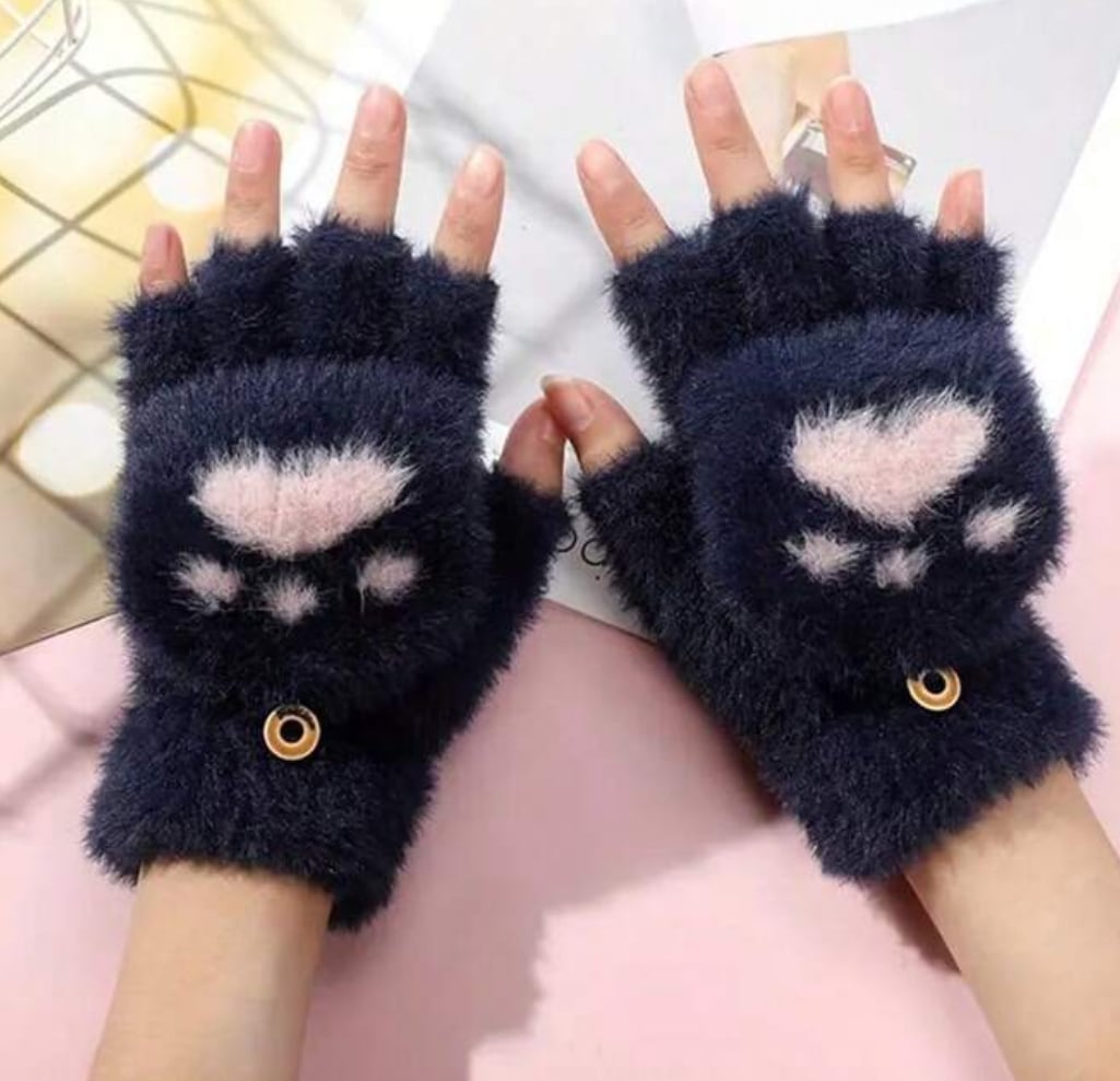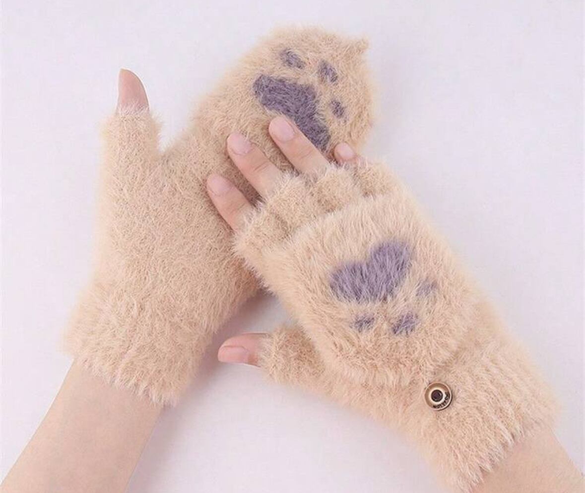 寒い時はボタンをとって指を隠すと、肉球が現れまるで猫の手のように。