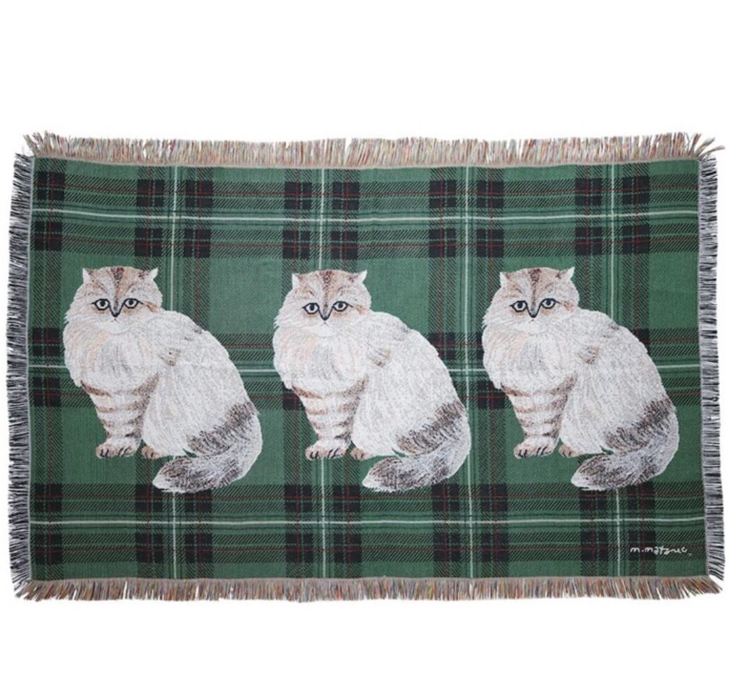 松尾ミユキさんの温かなタッチで描かれたネコたちのタペストリーラグ。