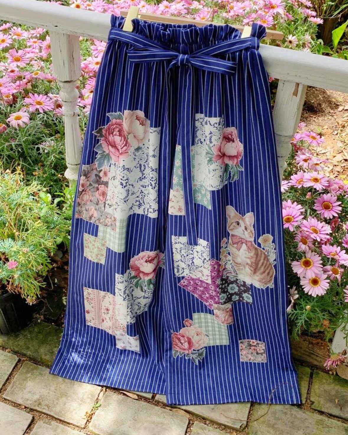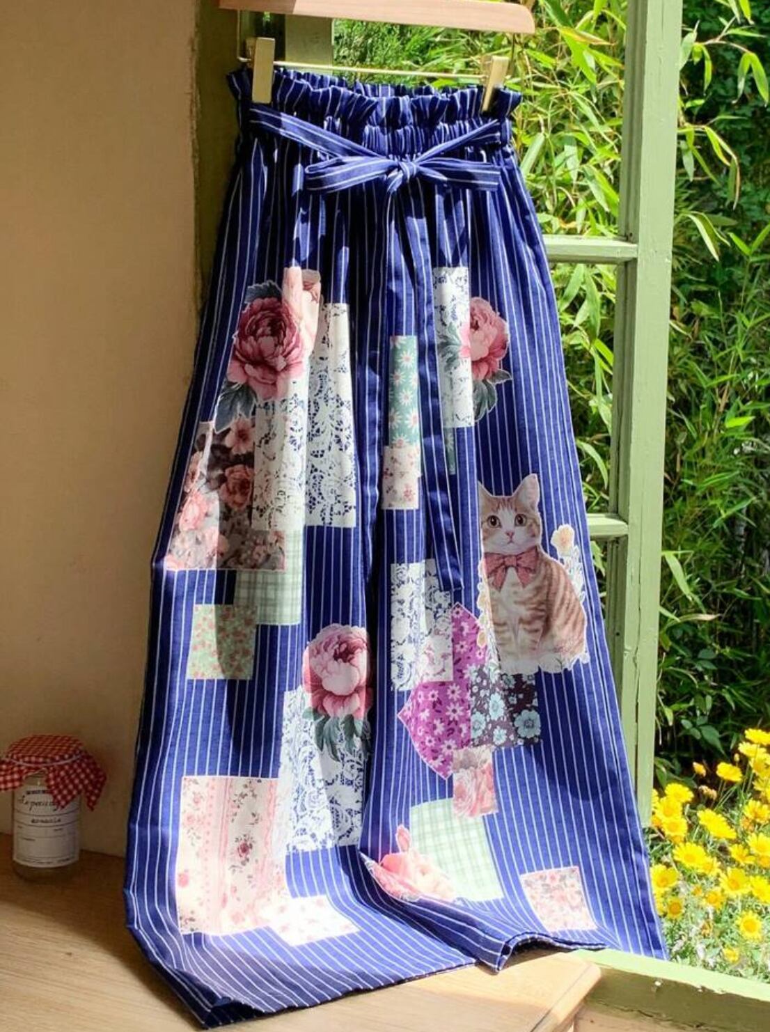 ヴィンテージ風の猫とお花、レースなどのプリントが可愛いストライプのワイドパンツです。