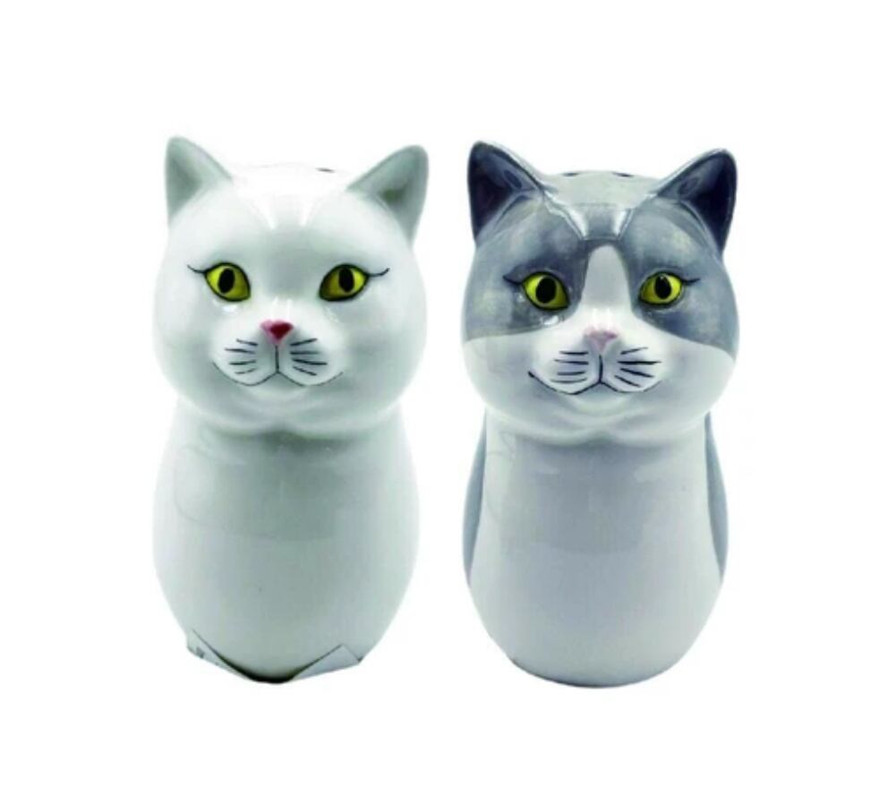 ネコをモチーフとしたソルト&ペッパーセット。2個穴が空いているタイプは、さらさらした塩用。3個穴が空いているタイプは湿気を吸いやすいコショウ用です。