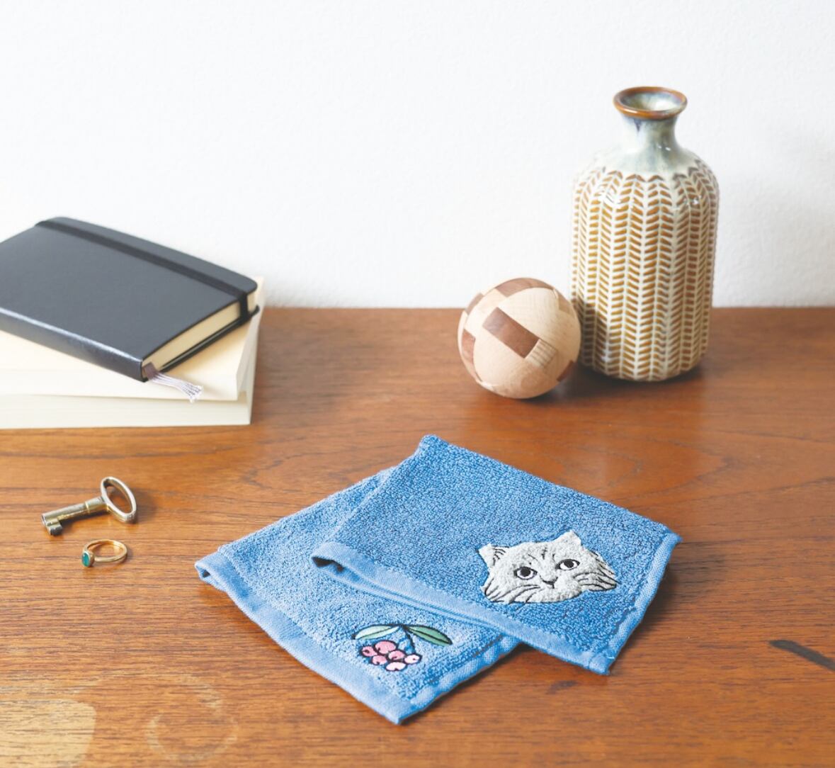 松尾ミユキさんデザインのネコ顔モコモコ刺繍に加え、植物モチーフの刺繍が添えられていて、とても愛らしい仕上がりです。
