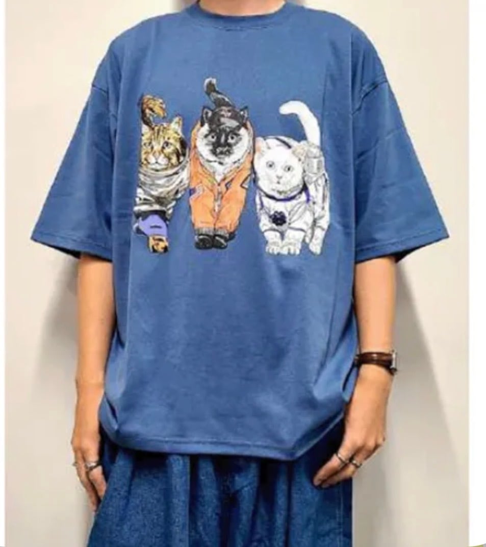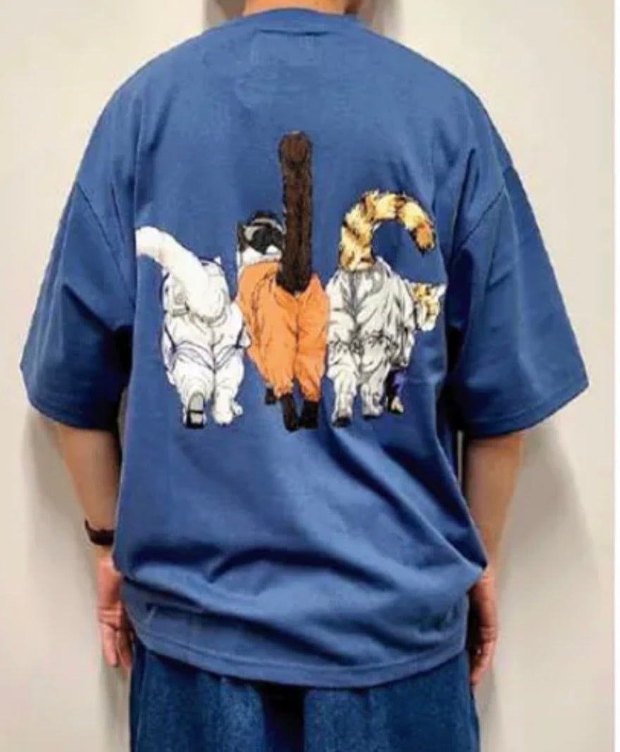 Tシャツでも大人気だった猫犬シリーズから動物宇宙Tが登場!前後のプリントどちらも見て欲しい、猫たちのグラフィックがユニークなアイテム。バックスタイルには猫たちの後ろ姿が描かれ、注目されること間違いなし!オーバーサイズに着用できる肩幅と身幅を広めにとったユニセックスサイジングとなります。