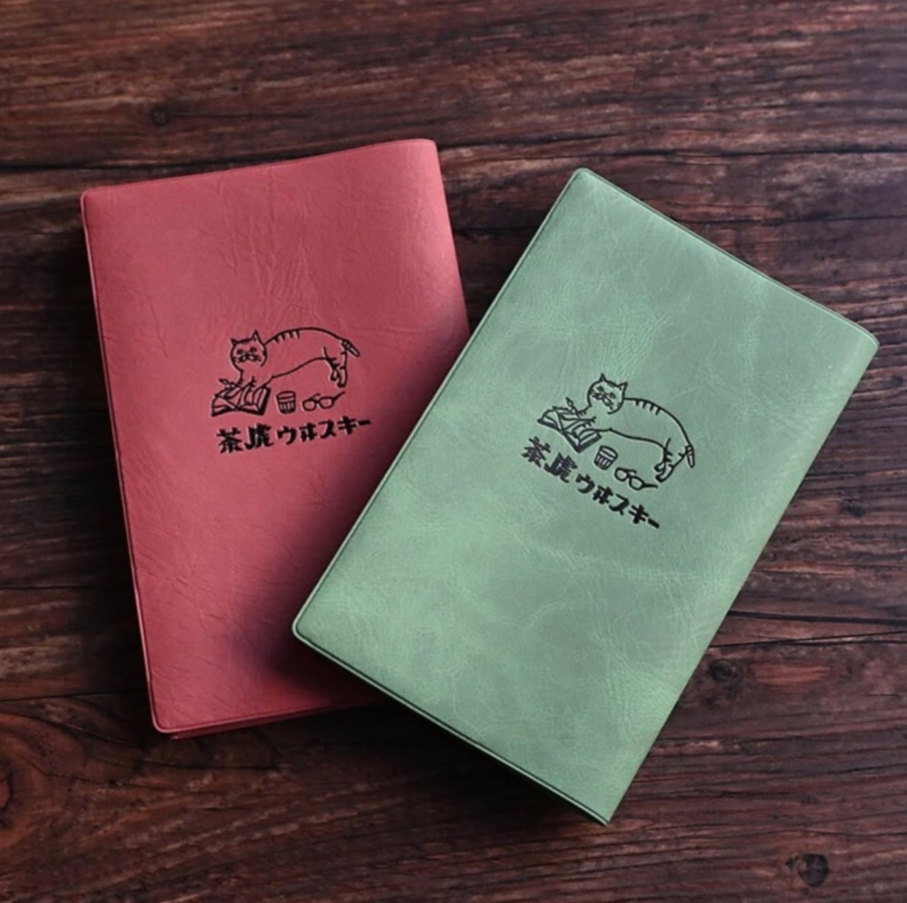 ふわっとした手触りの渋いカラーの合皮素材に、茶虎ウヰスキーのロゴを施しました。