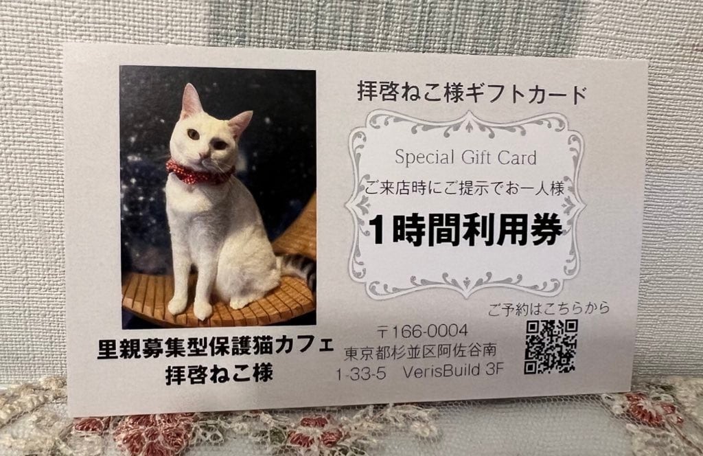 保護猫カフェ拝啓ねこ様を1時間利用できるギフト券になります。