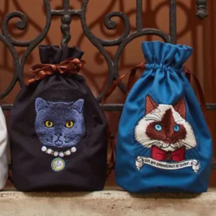 おめかししてすましたお顔の猫ちゃんがなんとも可愛らしい、巾着型ポーチ。刺しゅうされているのはヨーロッパで産まれた猫たちです。