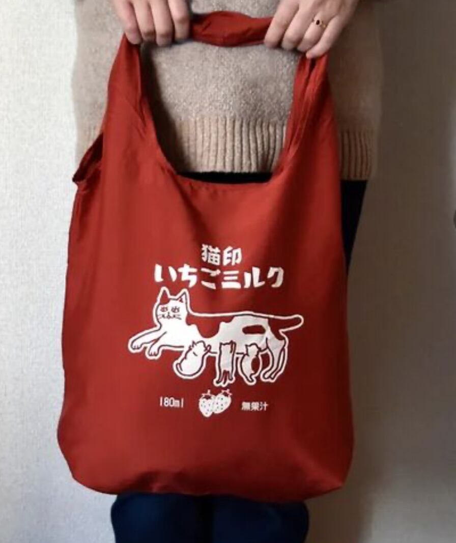 インパクトと遊び心が詰まった、いちごミルク柄(赤)のエコバッグが登場。