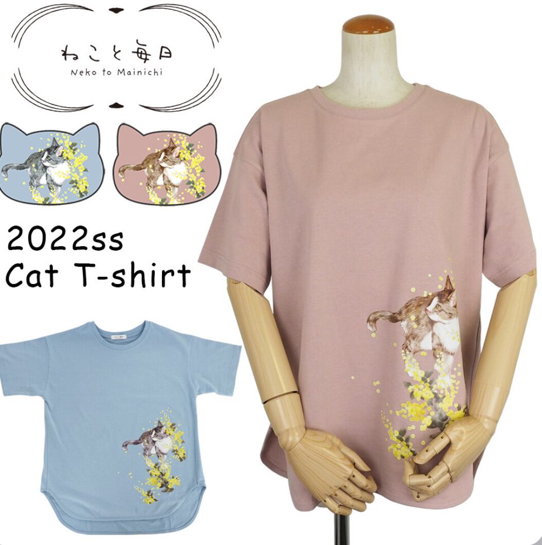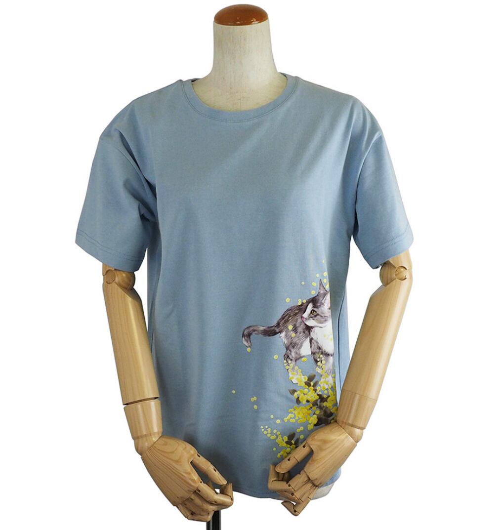 ねこと毎日 猫&ミモザプリントTシャツ ブルー