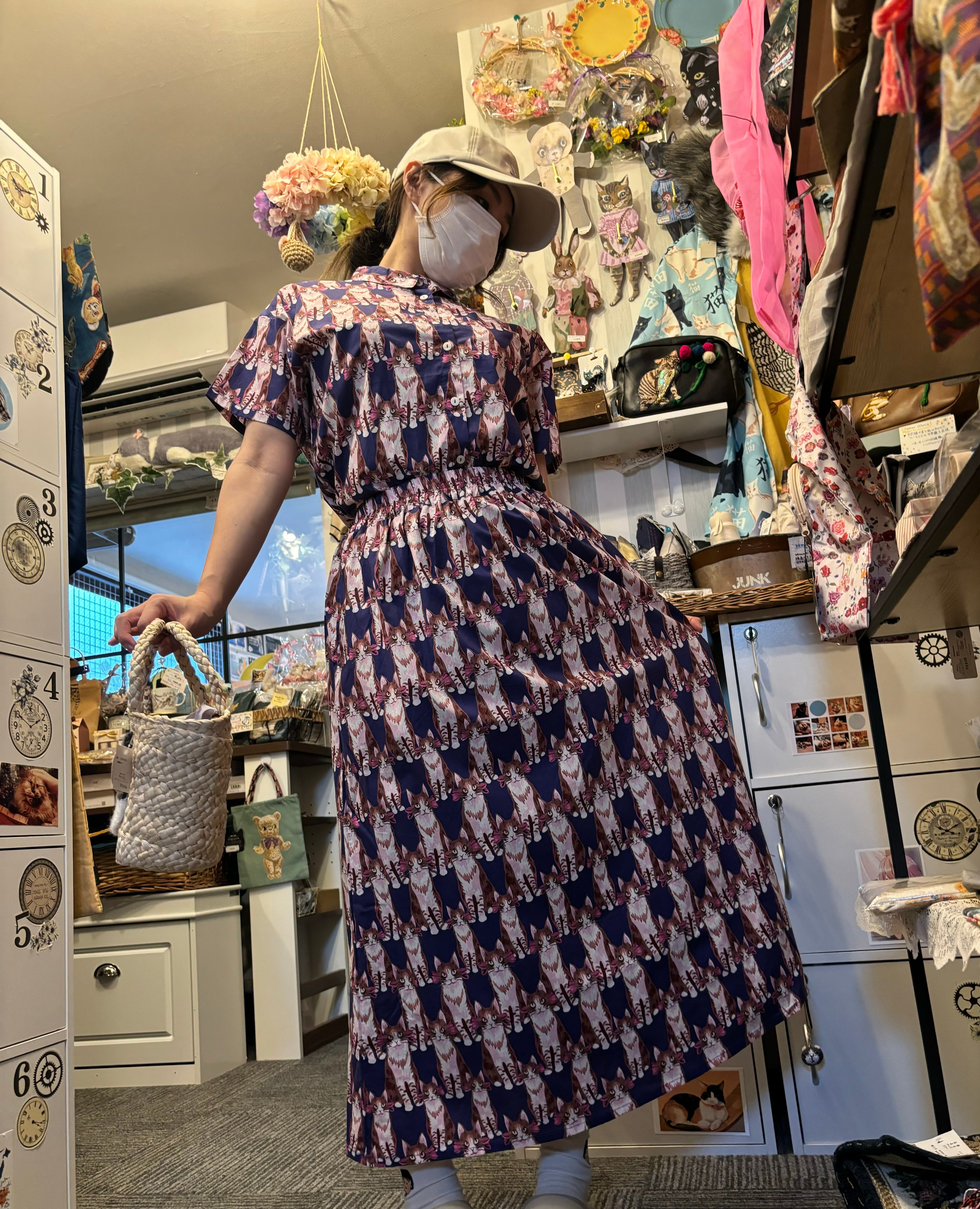 ネコのプリントが印象的なギャザースカート。