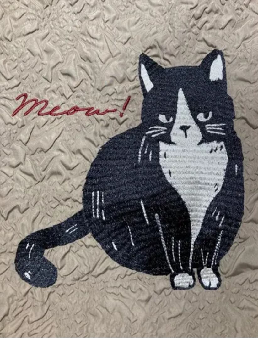 本体生地には地模様があしらわれており、さりげなくお洒落度がプラスされているのも嬉しいポイント!更にその生地には、何とも言えない表情のハチワレ猫ちゃんが刺繍されており贅沢な仕上がりとなっております。