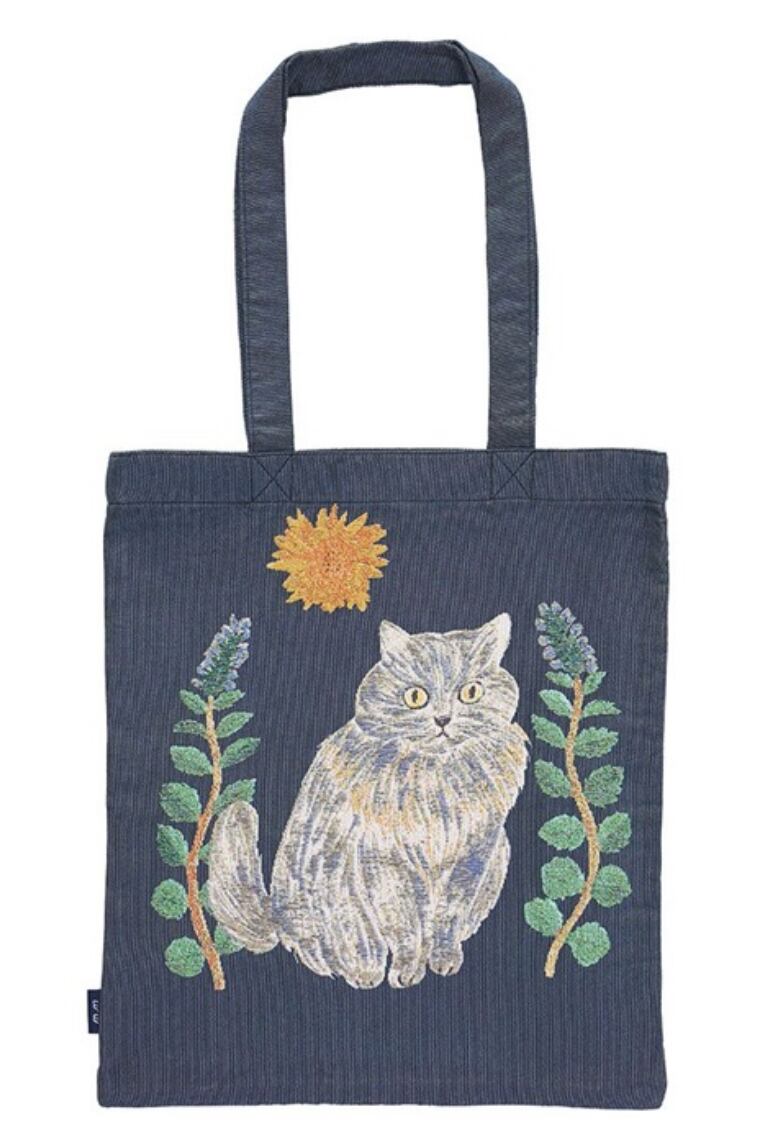 こちらをじっと見つめる個性豊かなネコたちと様々な植物が組み合わさり、とても愛らしいトートに仕上がりました。