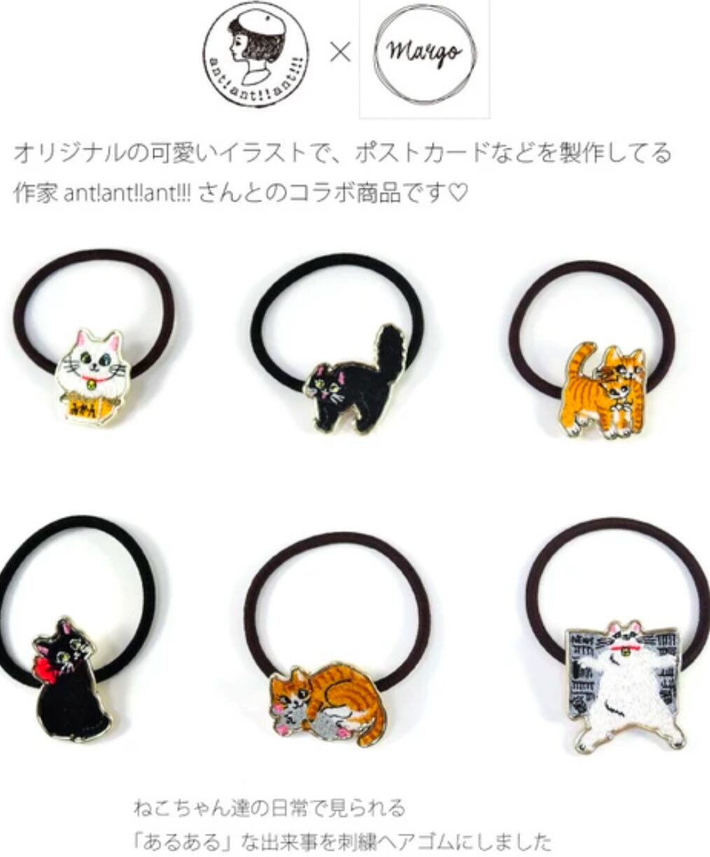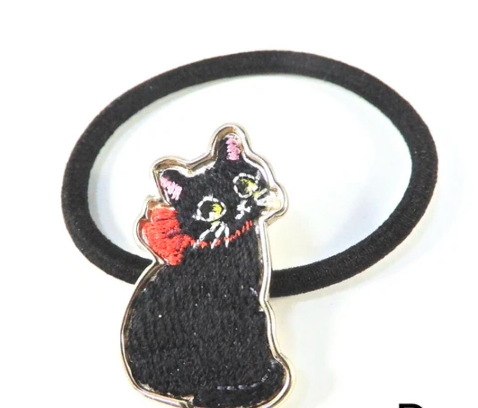 ねこの「あるある」刺繍ヘアゴム 赤リボン猫