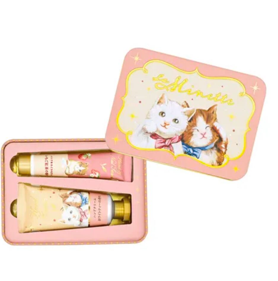 可愛い猫の絵柄の缶にハンドクリームとハンド&ネイルセラムが入ったハンドケアセット。