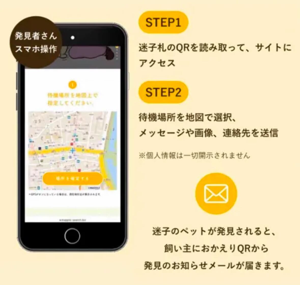 ペットが迷子になった時、災害等が起きてペットと離れてしまった際、保護した人が迷子札にあるQRコードを読み取ると、飼い主さんにペットの居場所を地図付きメールで連絡ができます。