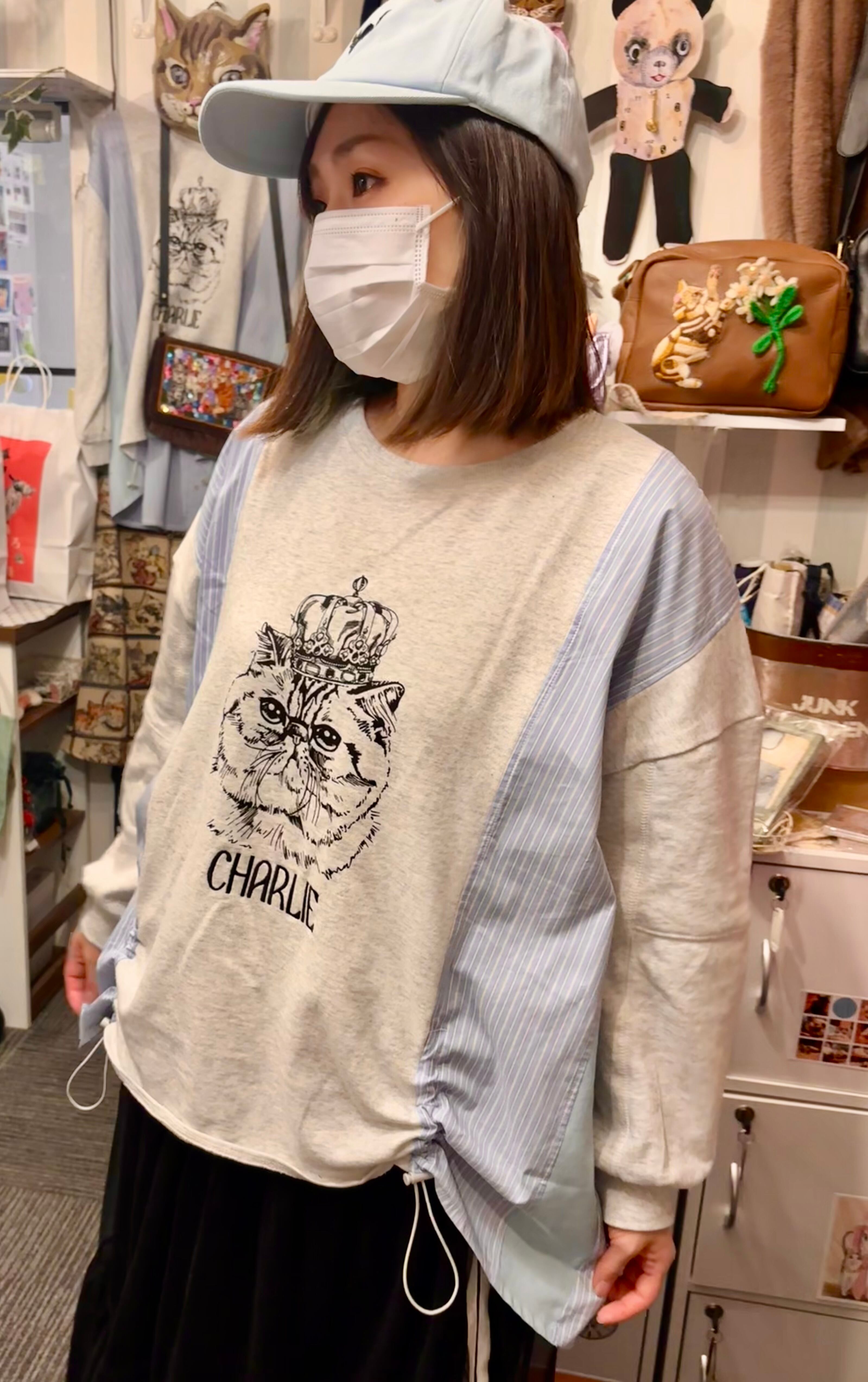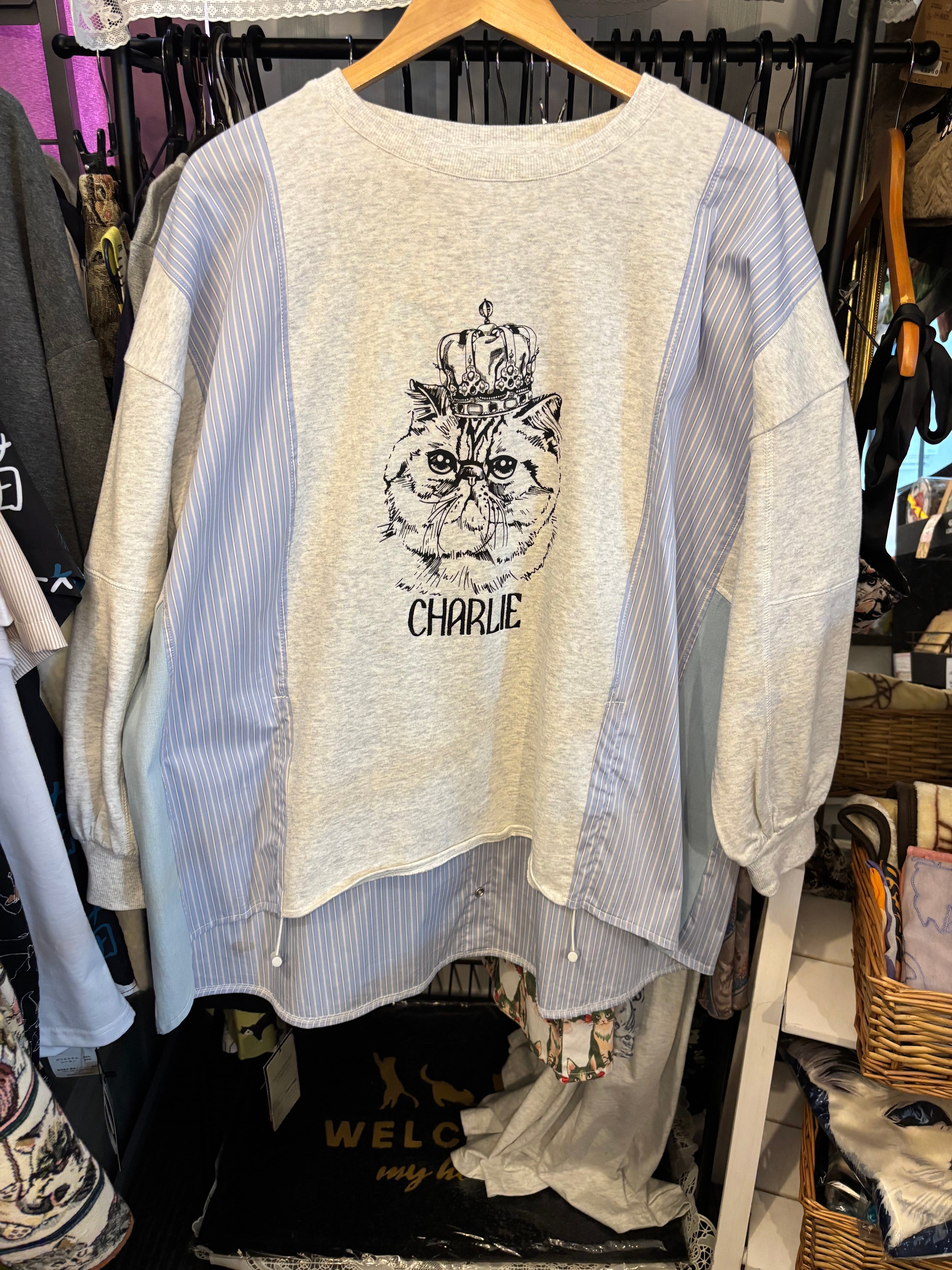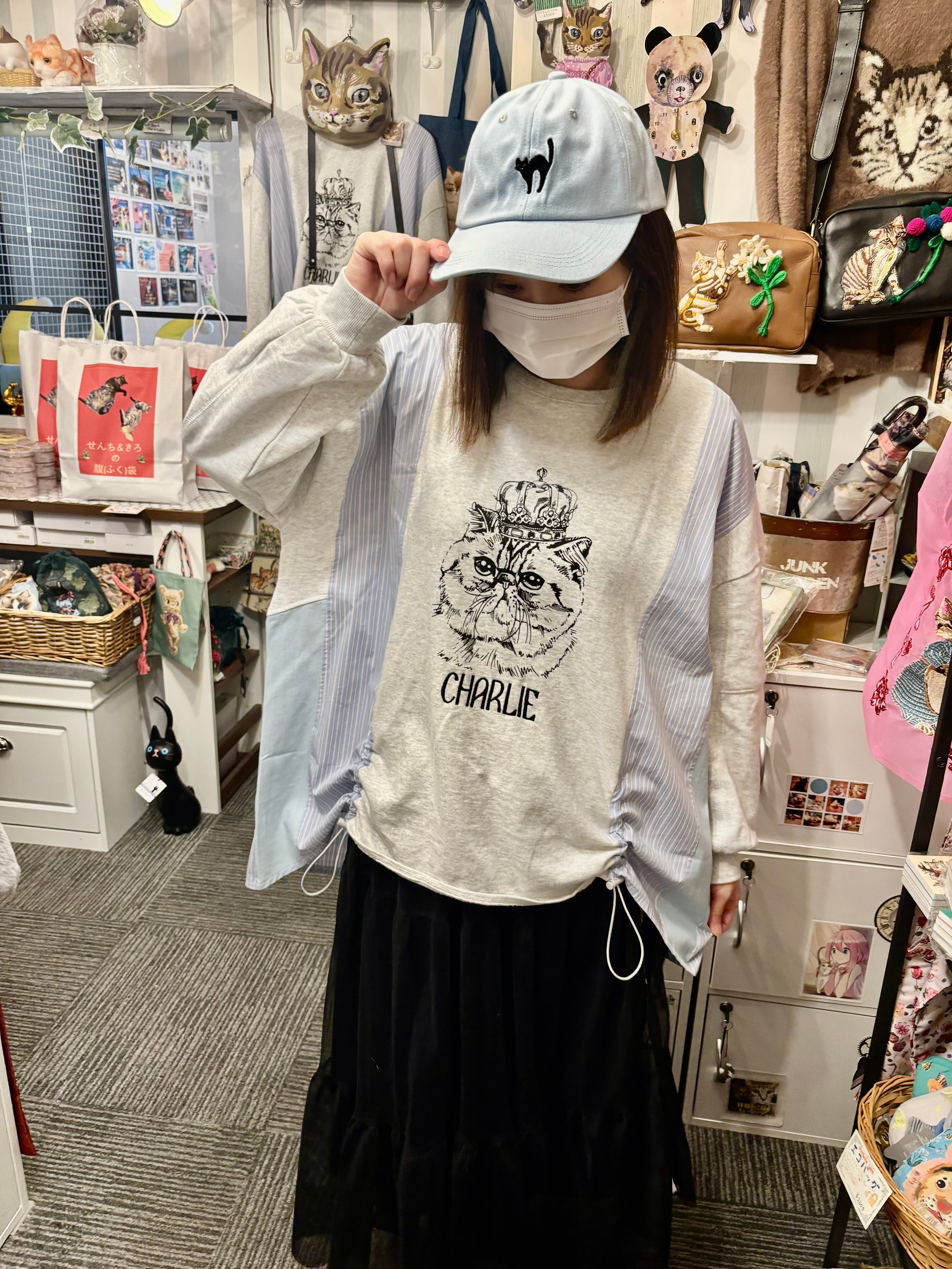 フロントには愛らしい猫のプリントと「CHARLIE」の刺繍が施され、カジュアルながらも存在感のあるデザインに。