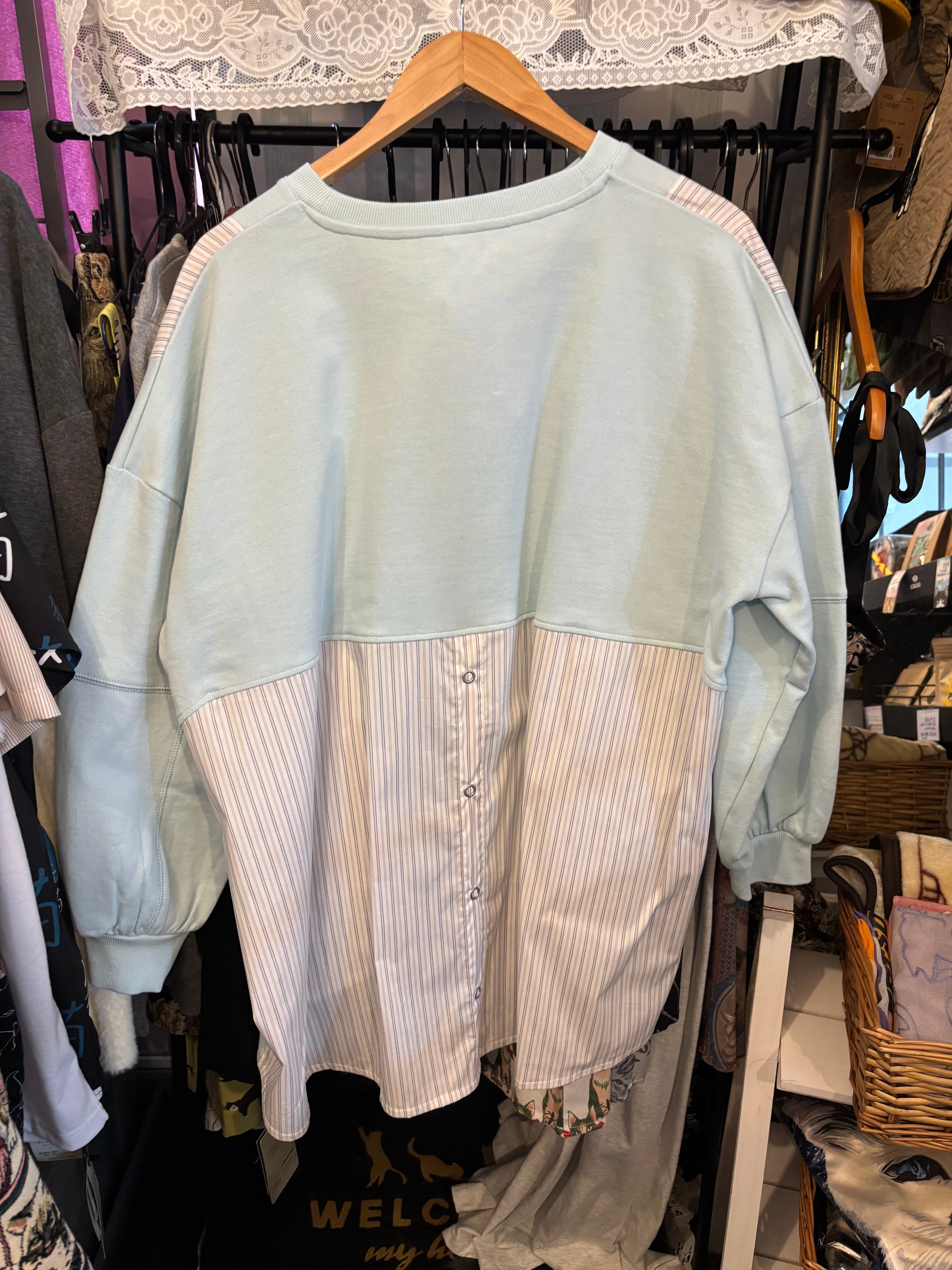 背面にはストライプ柄シャツ生地が大きく使用され、裾部分にかけてシャツのようなディテールをプラス。