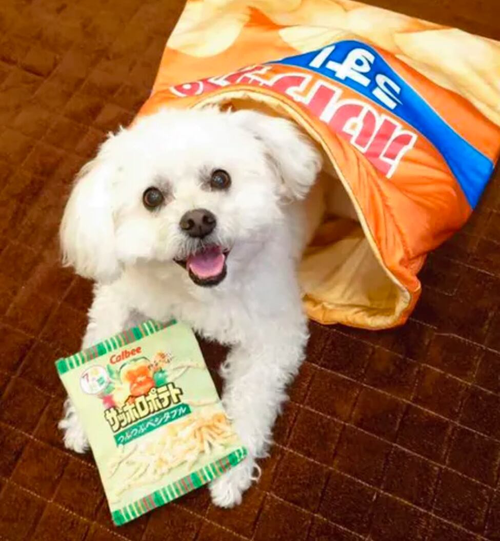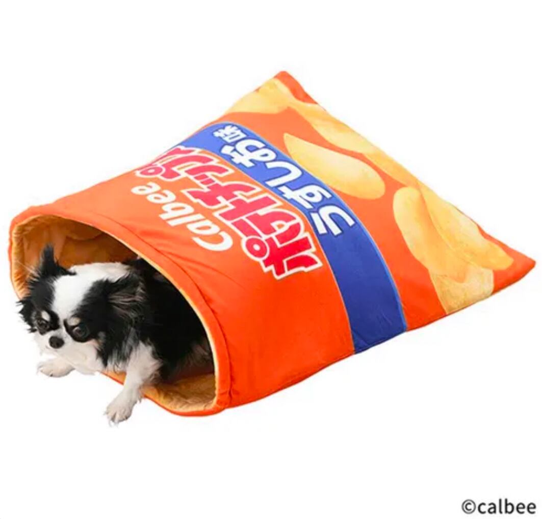 カルビーが販売する人気商品のパッケージがリアルにデザインされたペット用のベッドが新発売!